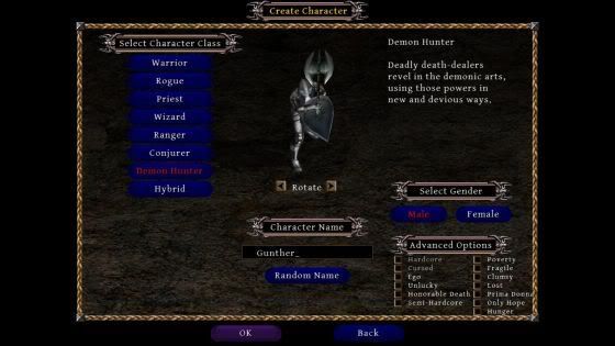 There are seven classes in Din’s Curse(counting Demon War in) and with the ability to build your own hybrid class, you could create a combination of many different type of custom classes. You have the base classes such as the warrior(often the most played in games like these but not my favourite choice), rogue, ranger, wizard, priest, conjurer(this is the class of choice for those that liked the Necromancer in Diablo II), and the demon hunter(in the Demon War expansion).